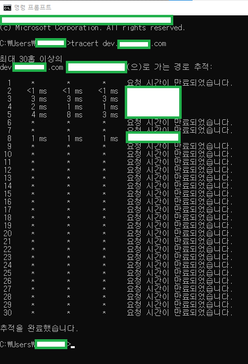 cmd창에서 tracert dev.------.com 명령어를 실행하면