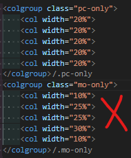 1. colgroup 을 'pc-only', 'mo-only' class를 사용해 'display: none', 'display: block' 처리를 한다.